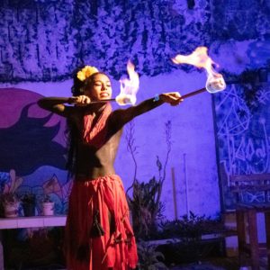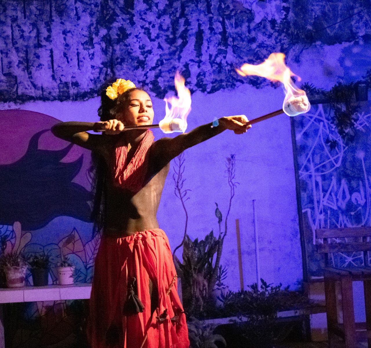 Marias veem tudo nascente morrer, seus corpos seguem o caminho cantando dores e histórias de muitas de nós, que se entrecruzam e pulsam na dor, no choro e na força de seguir caminhando, das Marias meninas, mulheres, das 13 que se vão diariamente, mas principalmente das que seguem sendo exu-deus mulher (sobre)vivendo.